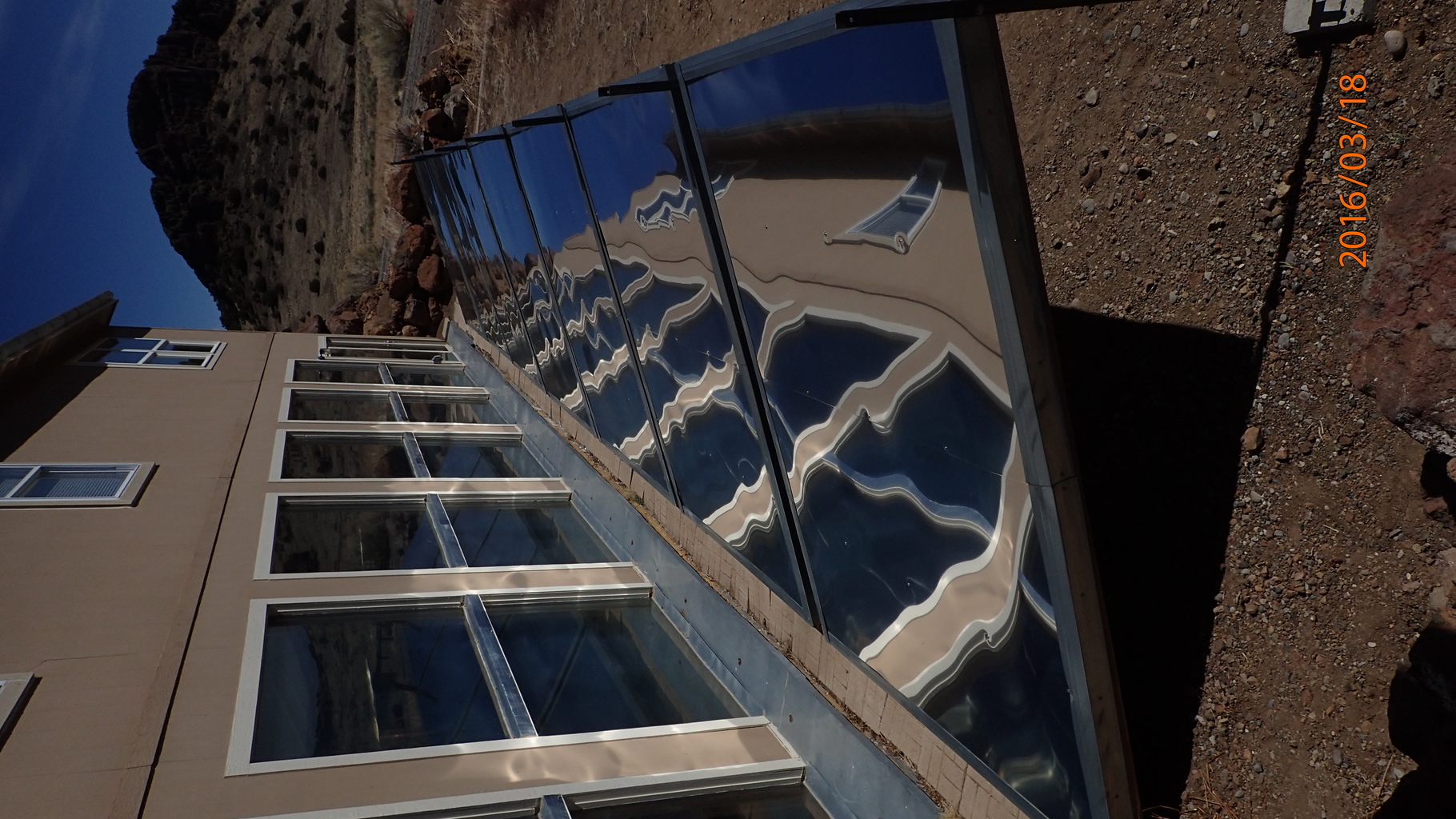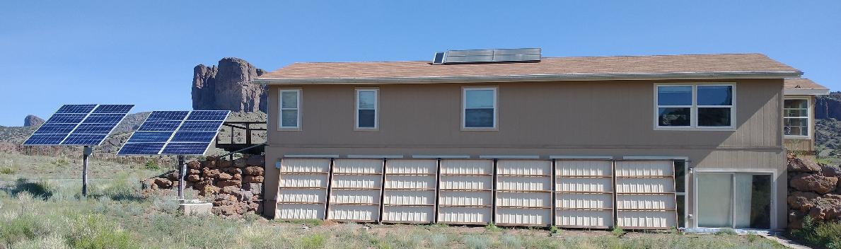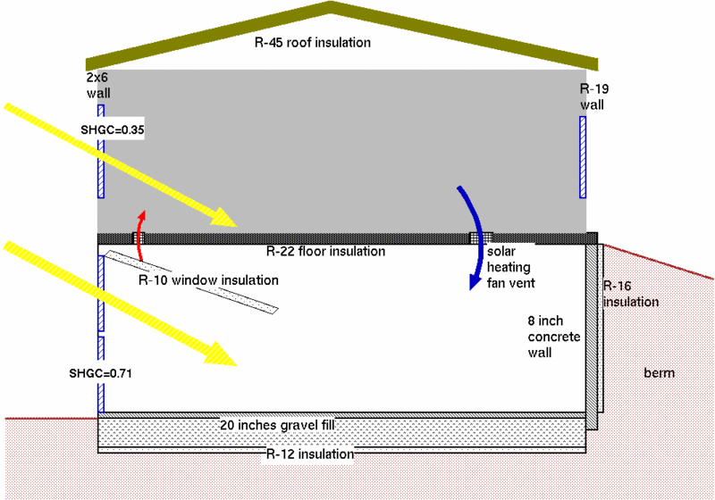 The basement of our house has been designed to serve several functions simultaneously. Like all foundations, it provides support to the house, but it is unusual because it also functions as a solar collector and thermal storage unit. The basement is not used for living space, though it is used for storage. The south wall of the foundation, which is 58 feet long, has a total of 14 46 inch by 76 inch insulated glass panes. We selected AFG industries Comfort E2 coated dual glazed air filled glass panes. There are 12 windows and one 7 foot wide sliding glass door. There are no other windows or doors. The windows are insulated with 1.5 inch thick Thermax (polyisocyanurate) panels during the night. The window insulation is raised and lowered under computer control with a garage door opener. The basement temperature is warmer than usual indoor temperatures, especially in the fall, which means it holds more thermal energy for the same mass compared to a traditional solar house. Separating the solar collector from the house has the additional benefit that the majority of the windows in the house need not face south. Our lot has wonderful views in many directions. The basement floor is a four inch thick concrete slab, painted black for efficient absorption of sunlight. Most of the thermal mass is below the slab in two feet of gravel fill, which is underlaid by 3 inch thick EPS insulation. The basement north, east, and west walls are 8 inch thick reinforced concrete, insulated on the outside with 4 inches thick EPS. Due to a contractor error, there is a two foot gap with no insulation around the foundation beneath the walls. The north, east and west walls of the basement are bermed, making the house effectively one story on the north side, and apparently two story on the south side. The basement has a framed room with the batteries and inverter for the photovoltaic system and a pressure tank to hold water from the well. Most of the space inside the basement is open, permitting air to circulate freely. Heat from the basement is circulated into the house through a system of vents and a computer-controlled 24VDC fan mounted below the floor of the house. In January 2012 we upgraded to a 12 inch Snap-Fan, which is very efficient and much quieter than the old fan. We are monitoring the performance of the solar basement by measuring temperature at several locations (e.g. house, basement air, basement north wall) and the use of the basement-to-house fan and the backup propane furnace. In January 2010 we installed solar reflecting panels in front of the basement windows to increase the solar energy entering the basement during the spring when the solar elevation angle is increasing rapidly but the outside temperature is still cold. There are seven panels, each approximately 6 ft by 8 ft in size, that are framed with pressure treated 2x4s and sheathed with steel roofing panels that were covered with ReflecTech, a highly reflecting adhesive film. In March 2016 we resurfaced the reflecting panels because the ReflecTech film had badly delaminated in many places due to incorrect installation. We attached PreMirror 11 Optima aluminum sheets from Lorin Industries to the steel roofing panels. The PreMirror 11 aluminum sheets are beautiful and highly effective at reflecting sunlight into the basement. The angle of the solar reflectors is adjustable in discrete increments from about 0o (used from Fall through January) to 28o (used in May). In 2021 we installed a horizontal bar near the top of the windows so that the reflectors could be tilted to near vertical to block most of the sun from the basement in summer. This is useful for preventing the house from overheating in September as the climate warms. |